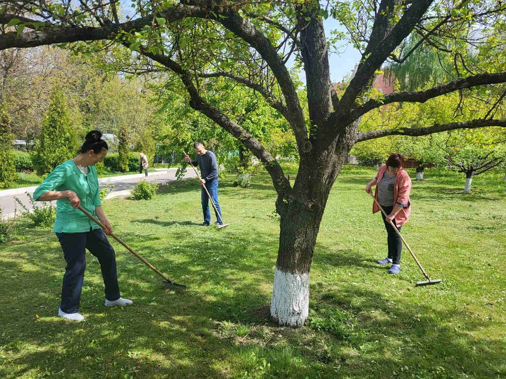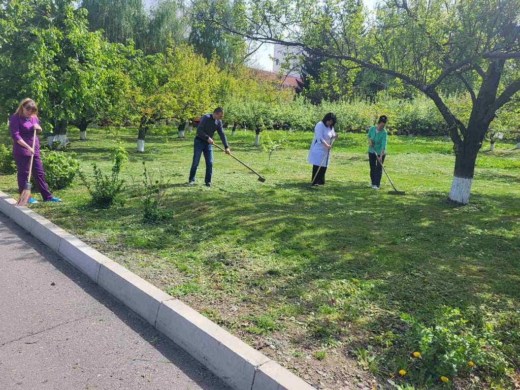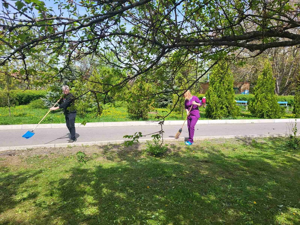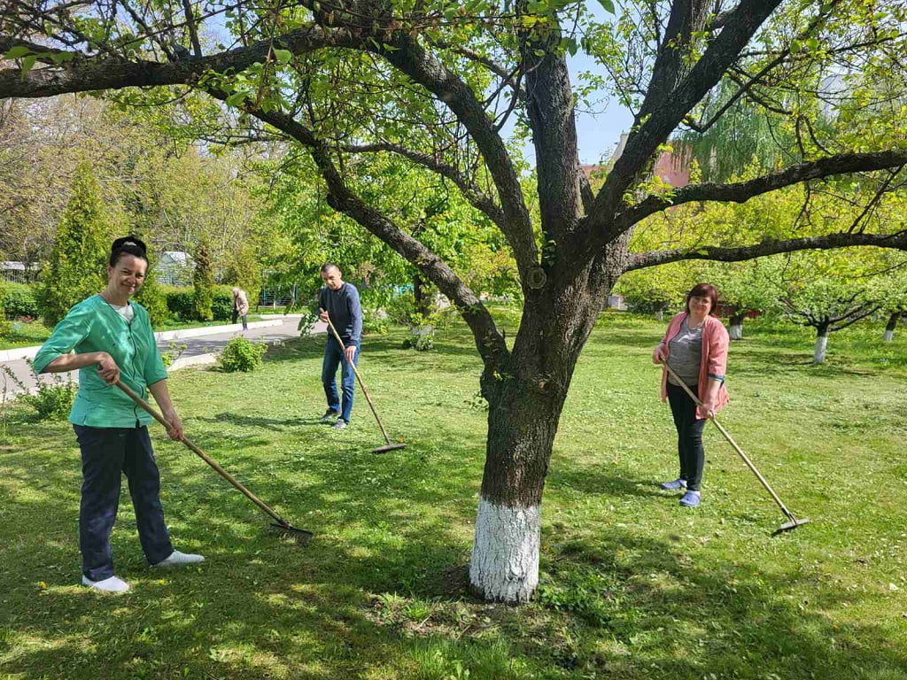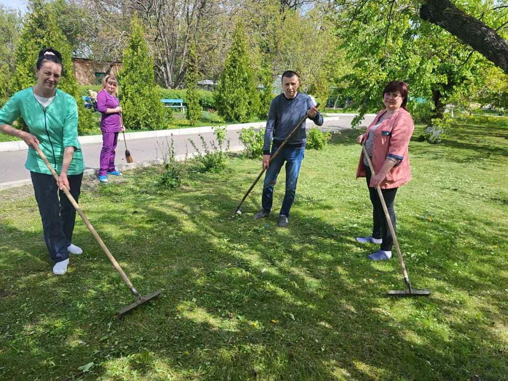 Роботи по благоустрою території пансіонату тривають. Скошено та прибрано траву в садку, підстрижено газони, скопано клумби під нові насадження. Роботи продовжуються.