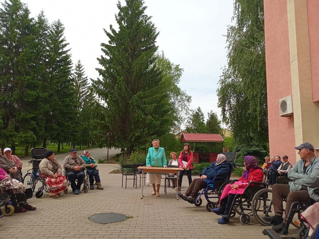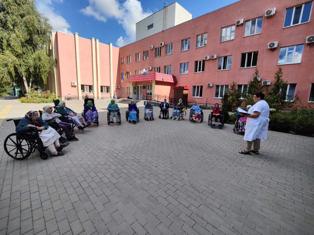 З настанням сонячного тепла у пансіонаті активно проводяться прогулянки на свіжому повітрі для маломобільних людей на візках. Під час прогулянки, під керівництвом фахівця з ЛФК, підопічні виконують вправи з лікувальної та гігієнічної гімнастики.