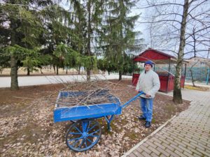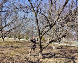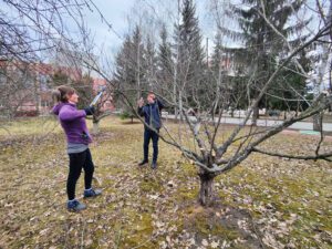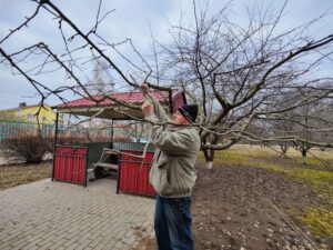 Значну територію навколо Горбанівського геріатричного пансіонату займає садок. Тут безліч різноманітних плодових та декоративних дерев. За садком доглядають з великою турботою. Згідно сезону проводяться відповідні роботи. Саме зараз пора обрізати та формувати крони дерев. Досвідчені спеціалісти своєї справи звертають увагу на кожне дерево.